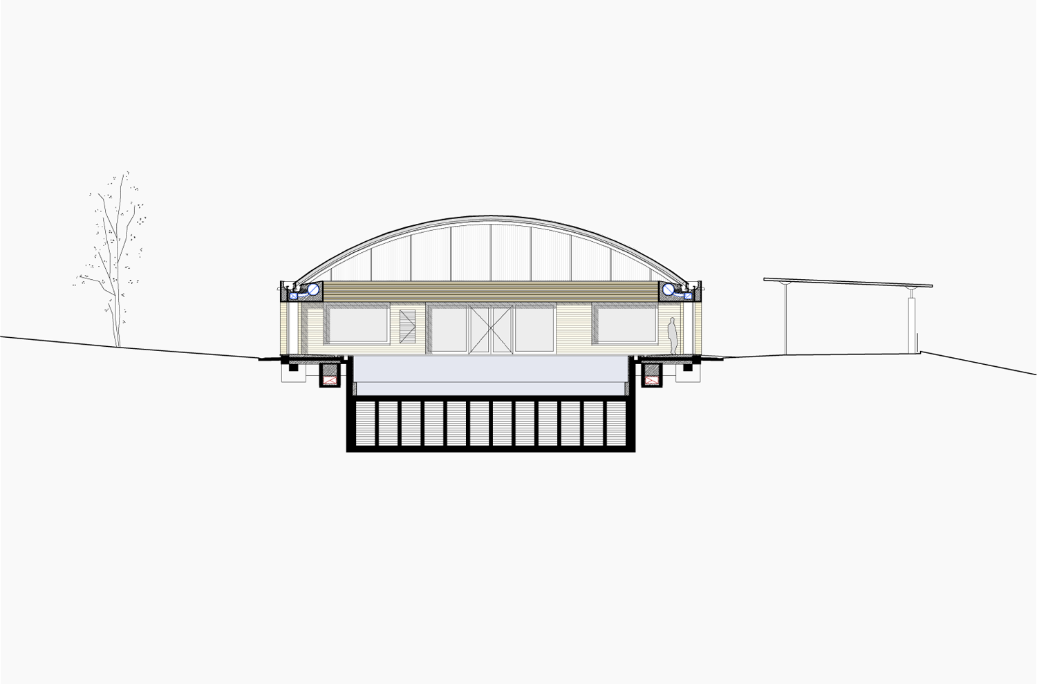 una estructura de arcos y paneles translúcidos. Se trata de una cubierta retráctil